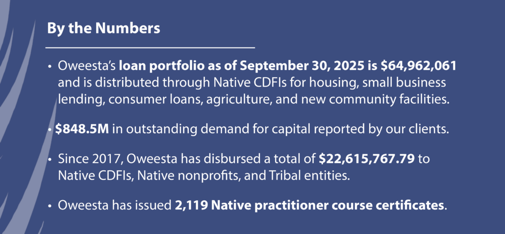 For more than 25 years, Oweesta Corporation has been dedicated to strengthening financial systems in Indian Country through capacity building and access to capital, primarily in service to Native CDFIs and Tribal communities.